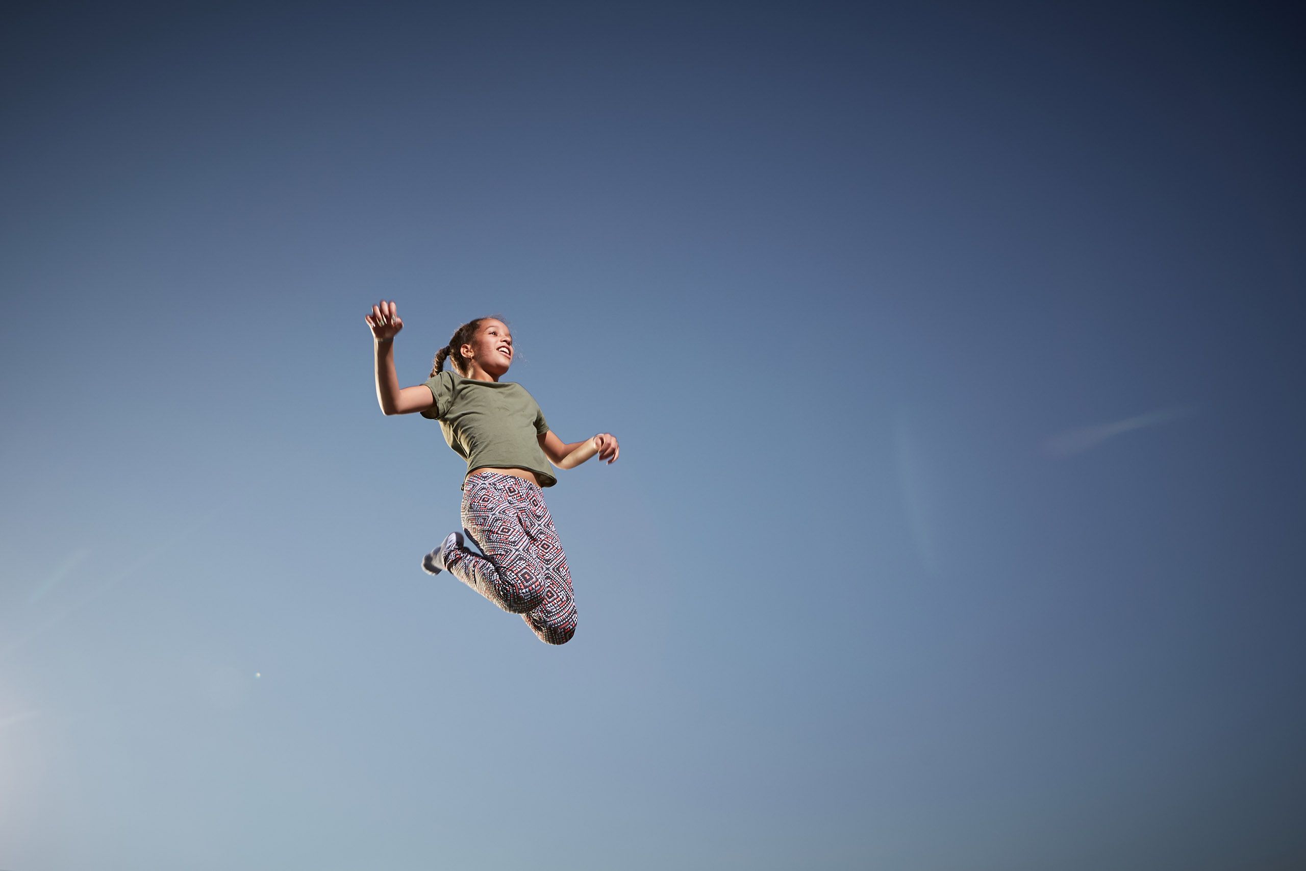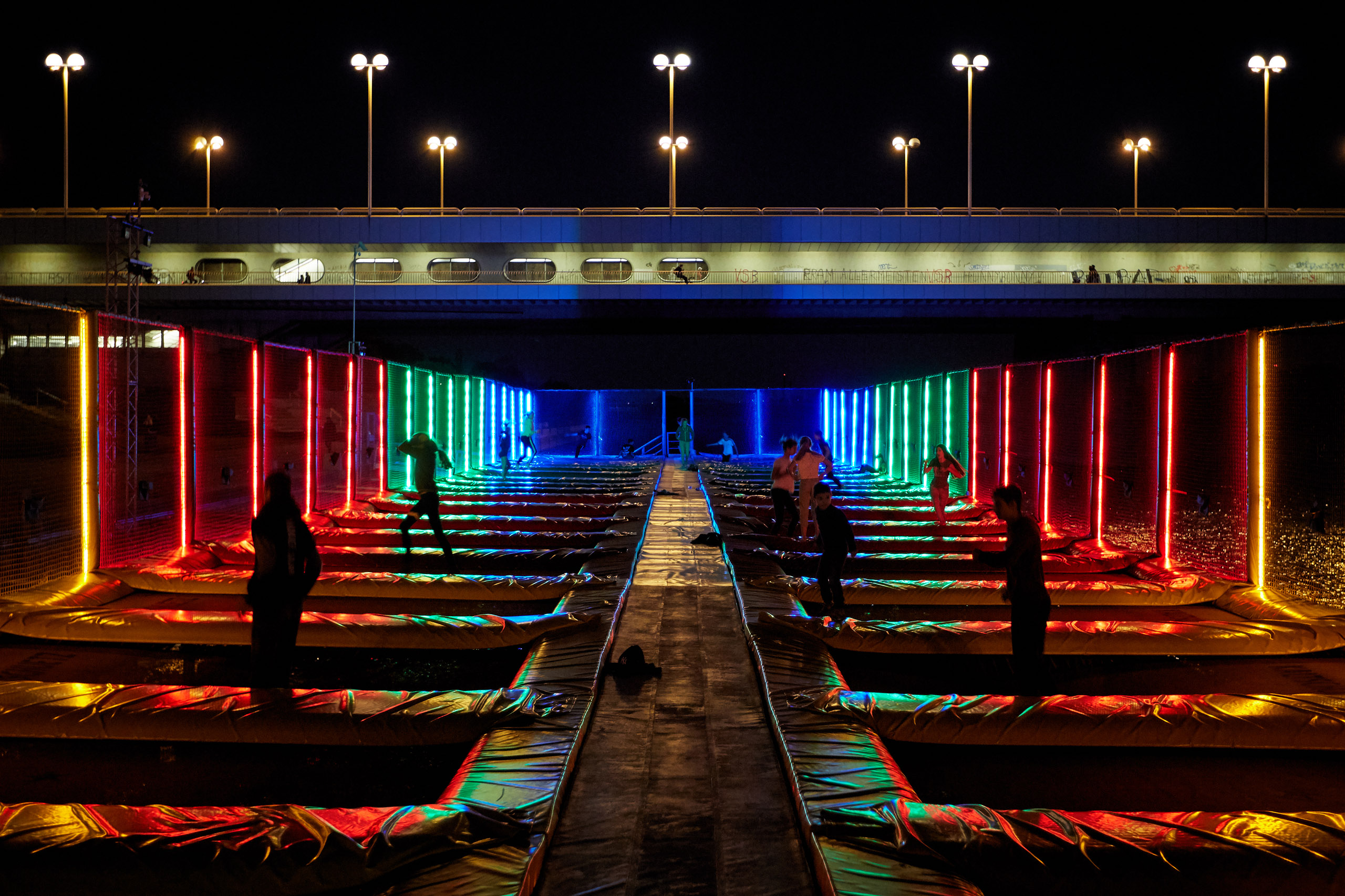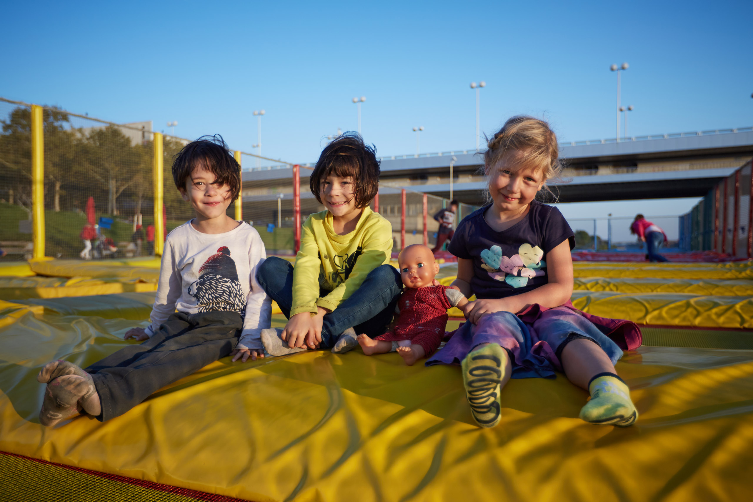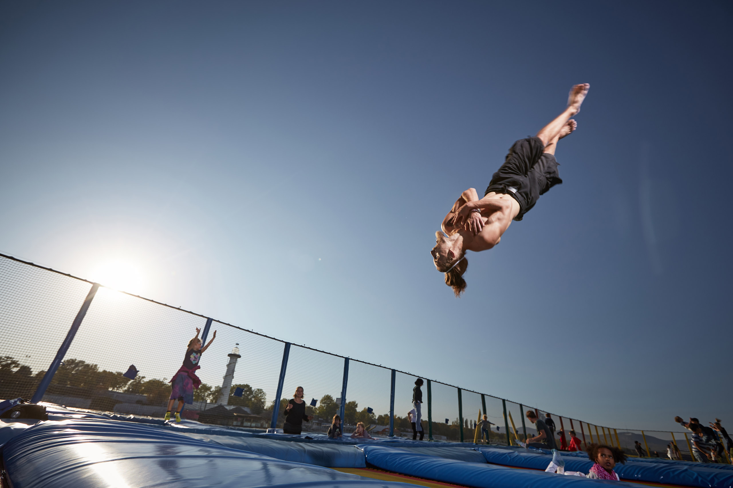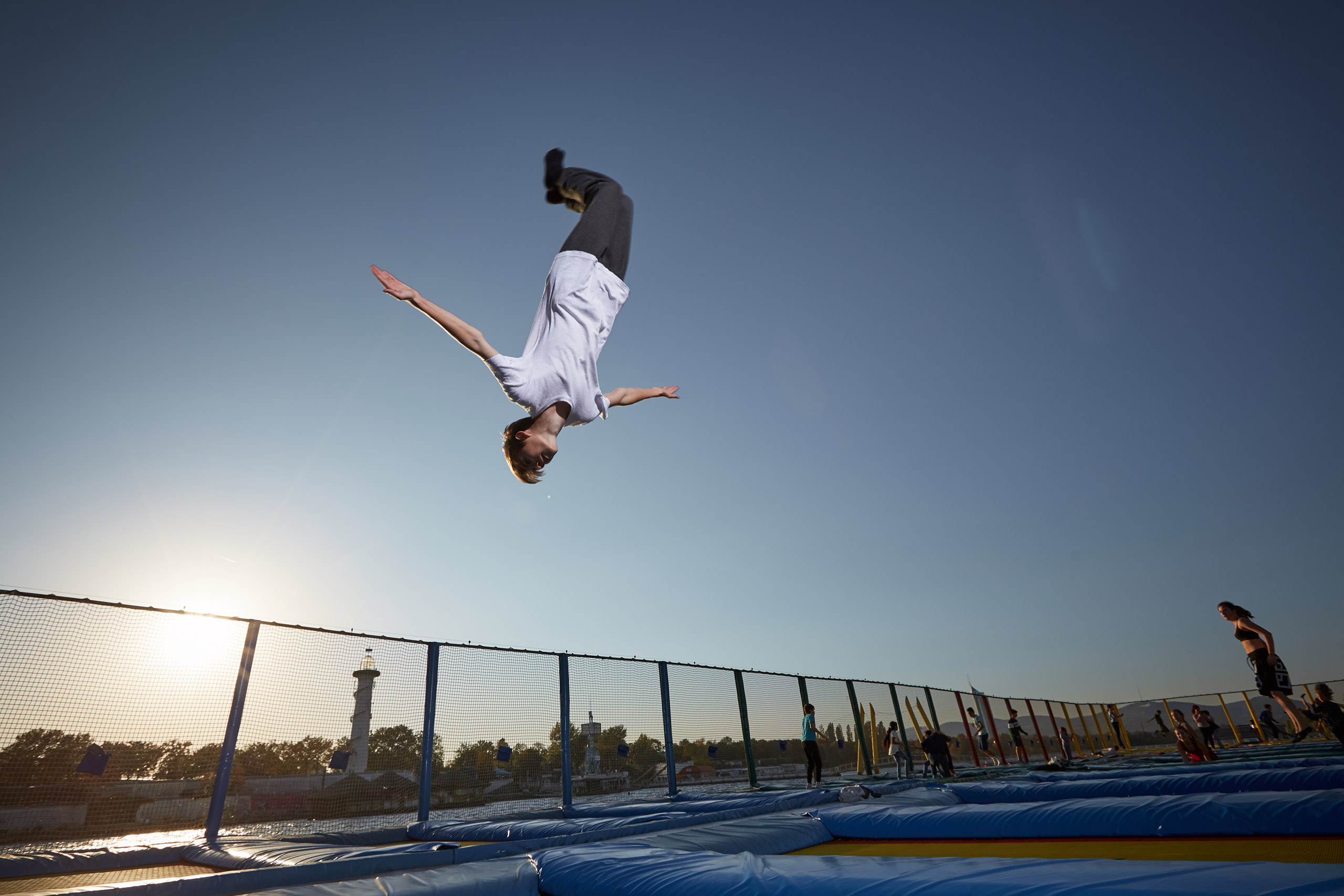 Für die Imagefotos haben wir die kleinen und größeren Trampolinspringer:innen mit Blitzlicht vor dem abendlichen Himmel inszeniert und die Anlage durch die blaue Stunde begleitet.