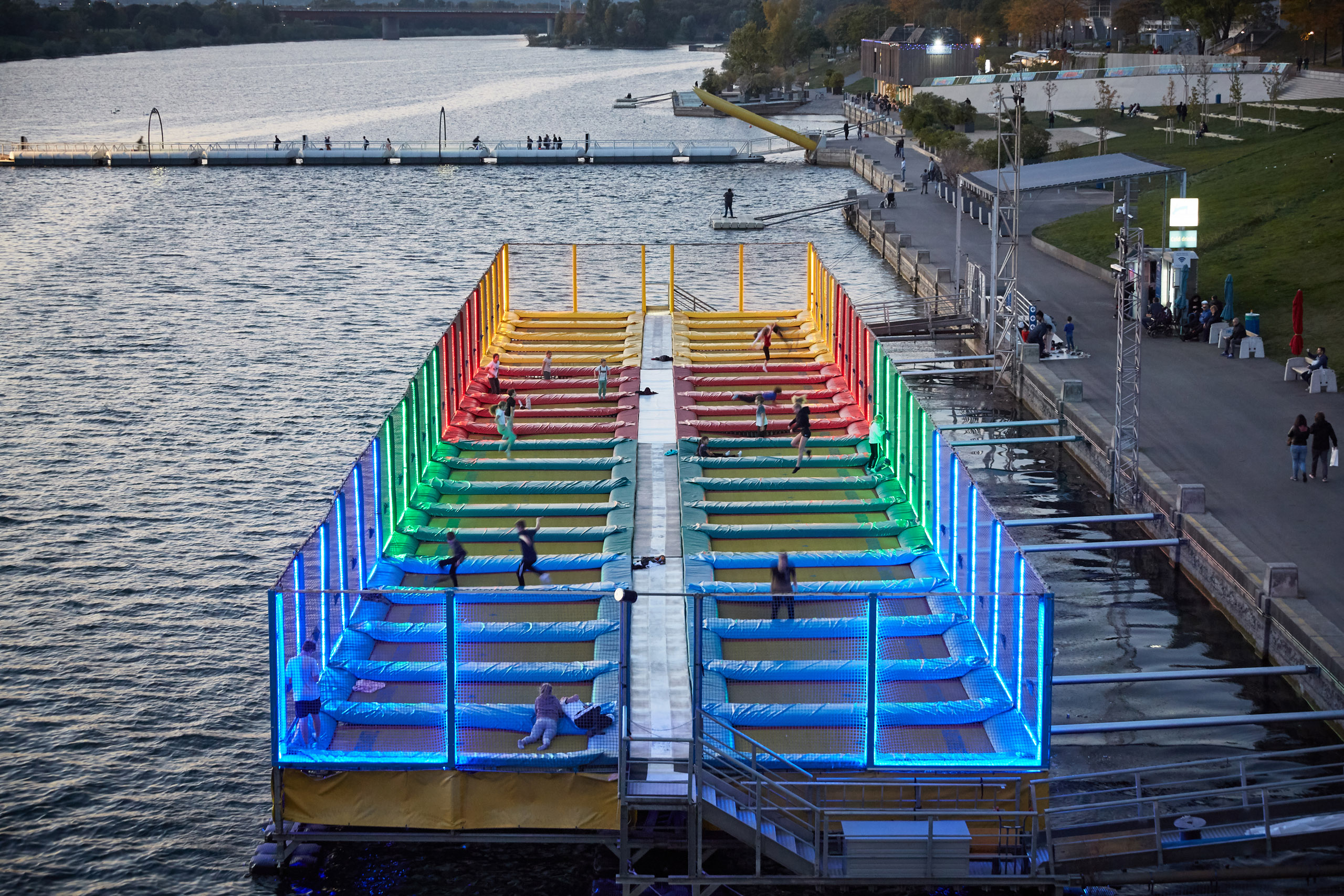 Danube Jumping am Copa Beach in Wien ist die weltgrößte schwimmende Trampolinanlage – und ein genialer Ort, um dort einen Sommerabend zu verbringen.